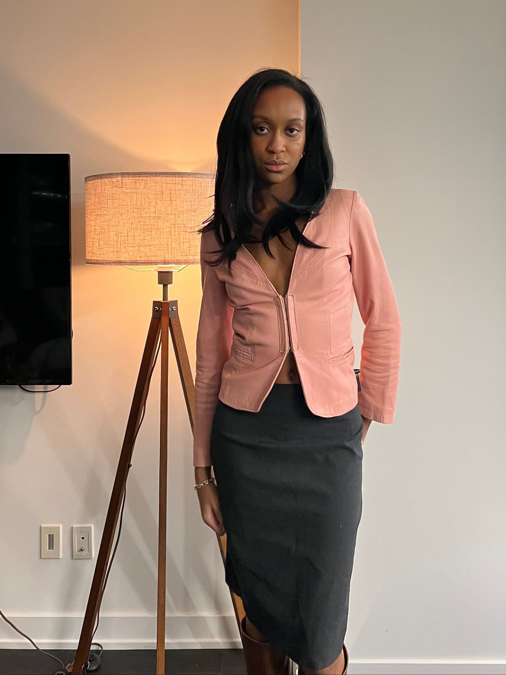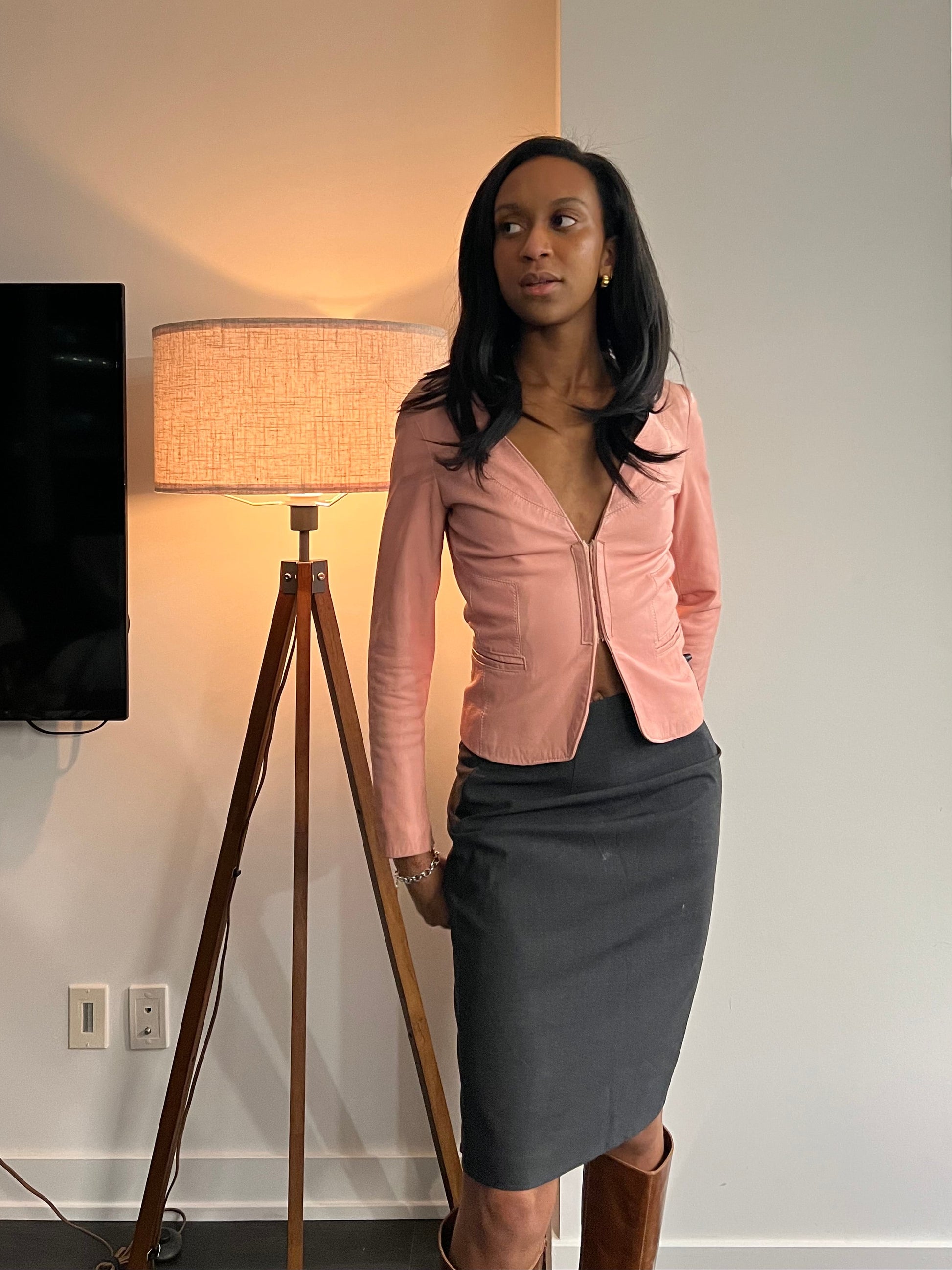 This Italian-made, genuine leather hook-front top is a standout piece in the most beautiful soft pink hue. Designed to fit beautifully, it features delicate hook closures through the front and adjustable sleeve hooks that can be worn clipped up or left loose for a more relaxed feel. A waist clip allows you to cinch the silhouette, worn either at the front or back, for versatile styling. Structured, flattering, and undeniably special.