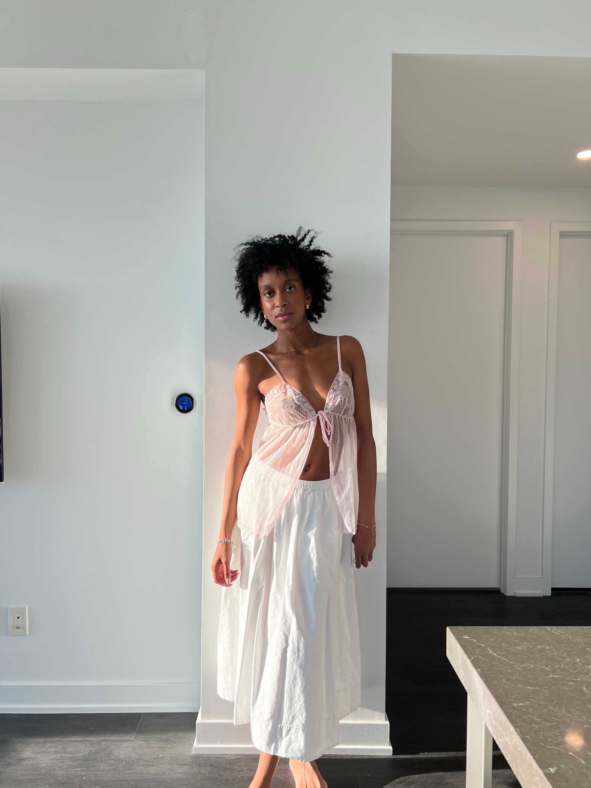 Romantic, whimsical, and undeniably feminine, La vie en Rose Blouse is a lingerie-inspired piece in delicate ballerina-pink lace. Sheer and airy, it ties at the front for a flattering, adjustable fit that works beautifully on a variety of body types. Wear it over a bralette, paired with a slip skirt, or on its own for a bold, playful look. Light, dreamy, and versatile, this blouse transitions effortlessly from dressy to casual.